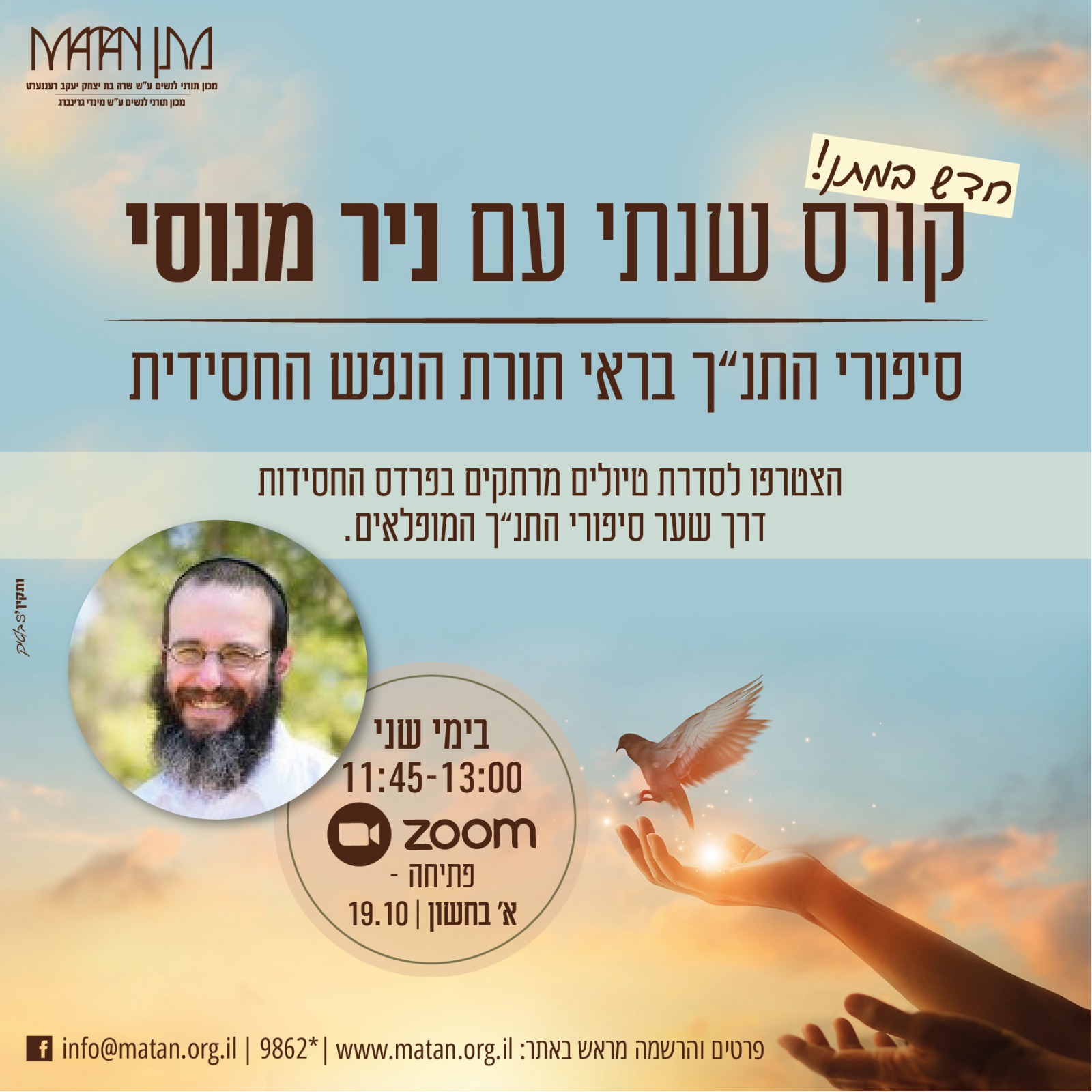 סדרה שנתית במסגרת מת"ן – מכון תורני לנשים. השנה נתמקד במעשה בראשית וסיפורי האבות. השיעורים יתקיימו דרך זום בימי שני בין 11:45 ל-13:00. מפגש ראשון: יום שני א' חשוון (19.10). עלות: 910₪. לפרטים והרשמה לחצו כאן וגללו למטה עד שתראו את הקורס.