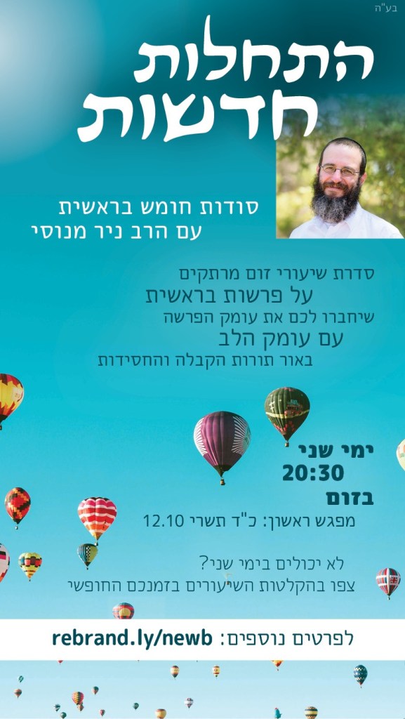 שיעור שבועי בפרשות חומש בראשית. השיעור ישודר בזום מדי יום שני בערב, בשעה 20:30. השיעור הוא לעת עתה ללא תשלום. מפגש ראשון: יום שני, כ"ד תשרי (12.10). לפרטים והרשמה לחצו כאן.