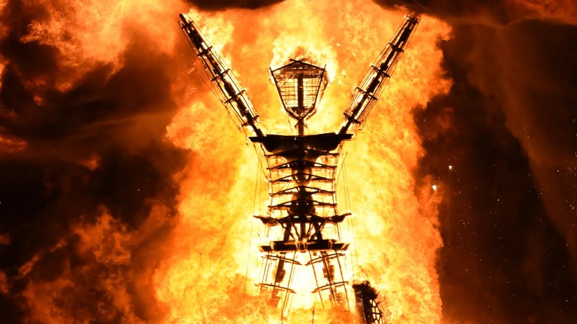 אחד המקומות בעולם בהם התנועה הזו מקבלת היום את הייצוג המוחשי החזק ביותר שלה הוא פסטיבל ה"ניו אייג'" הענק הנערך מדי קיץ בצפון מדינת נבדה בארצות הברית, הגדול ביותר מסוגו בעולם, והמכונה Burning Man – האיש הבוער. שבוע של סדנאות, מדיטציות ומעגלי שירה מגיע לשיא בהצתתו של פסל עץ ענק בדמות אדם. כל אלפי באי הפסטיבל חגים ורוקדים סביב הצלם הבוער, נושאים עיניהם אל המחזה המהפנט. המטרה ברורה: להתעצם עם דמות האיש הבוער, לחוש משהו מבערה זו בעצמותיהם שלהם.