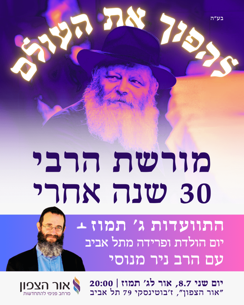 ההתוועדות תתקיים ביום שני, 8.7, אור לג' תמוז, בשעה 20:00 בבית הכנסת "אור הצפון", ז'בוטינסקי 79 תל אביב (חניונים מומלצים: בנין המאה, חוף אסותא)